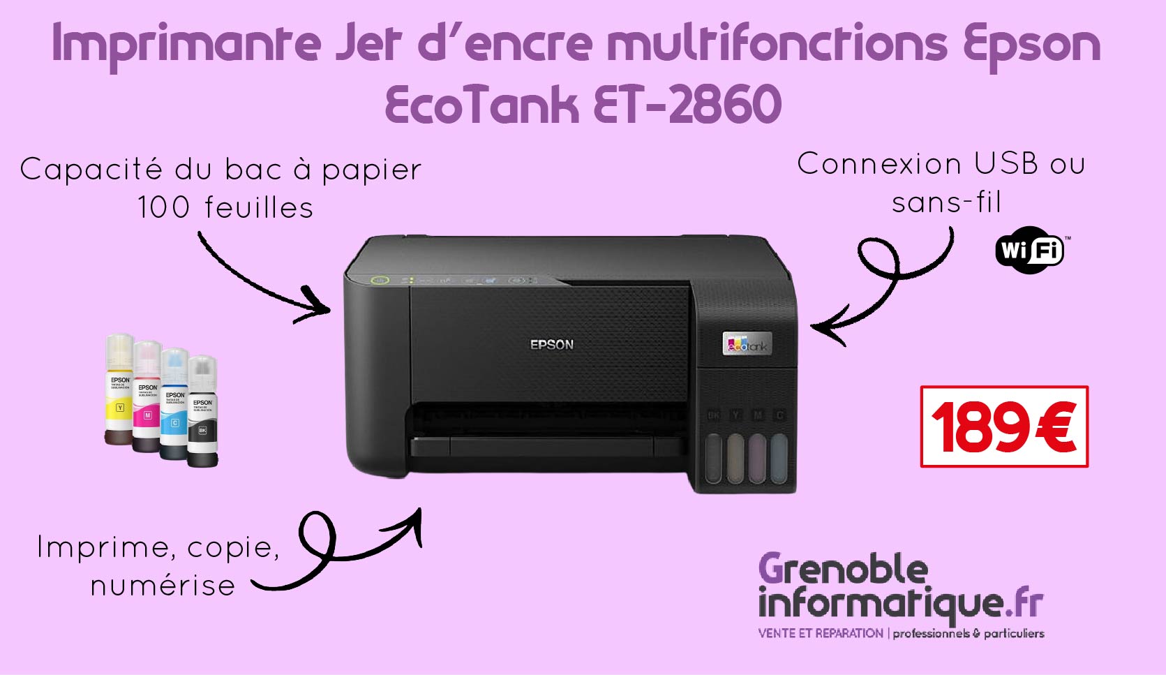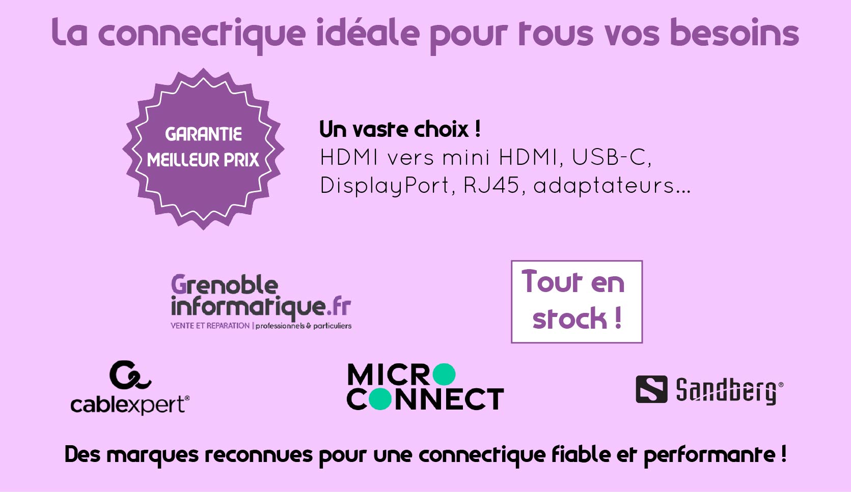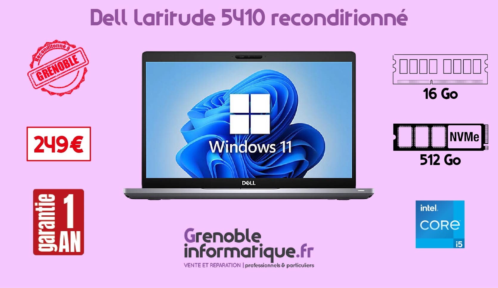 Partie gauche de l'image : forme rectangle avec un fond violet. Dessus, on y trouve une photo de la devanture du magasin Grenoble Informatique avec un récipient à piles. On retrouve des logos de partenaires ou de marques vendues comme la frp2i, Terra ou bien HP. On voit aussi l'enseigne avec le logo Grenoble Informatique vente et réparation pour professionnels & particuliers, le numéro et les logos Microsoft et Apple.