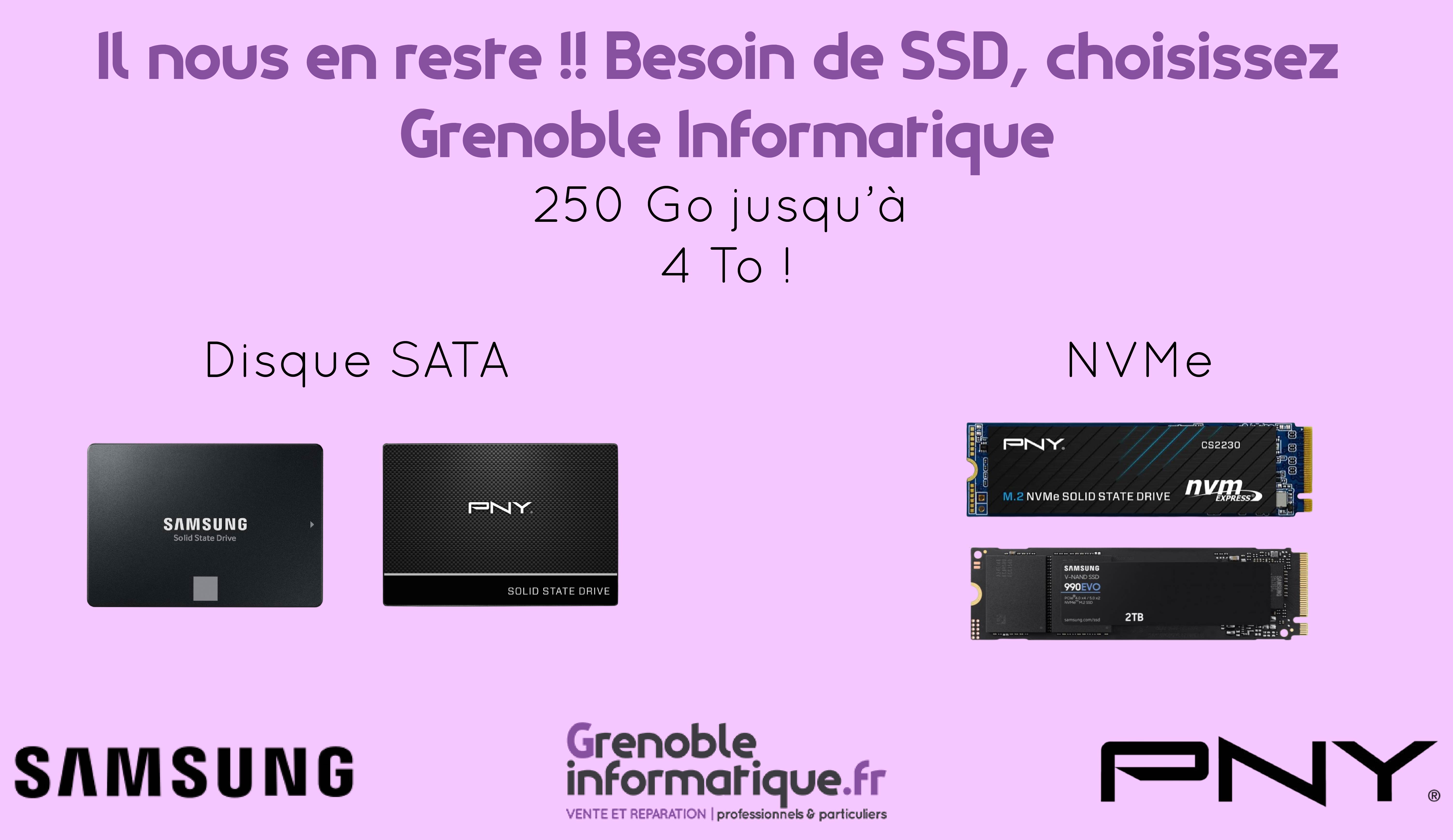 Partie gauche de l'image : forme rectangle avec un fond violet. Dessus, on y trouve une photo de la devanture du magasin Grenoble Informatique avec un récipient à piles. On retrouve des logos de partenaires ou de marques vendues comme la frp2i, Terra ou bien HP. On voit aussi l'enseigne avec le logo Grenoble Informatique vente et réparation pour professionnels & particuliers, le numéro et les logos Microsoft et Apple.